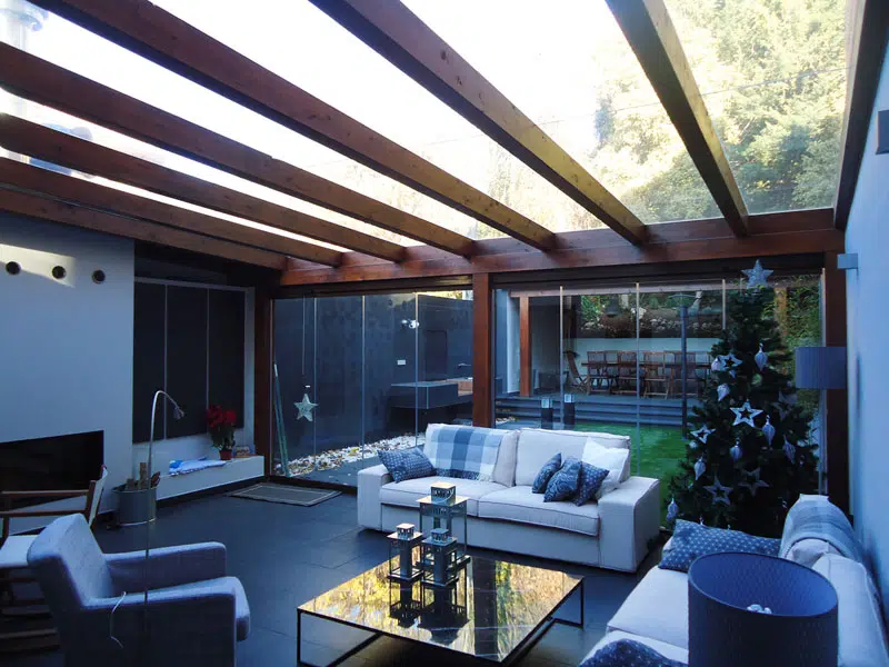 Cerramiento acristalado a partir de estructura de madera en forma de pérgola con cubierta de cristal de seguridad