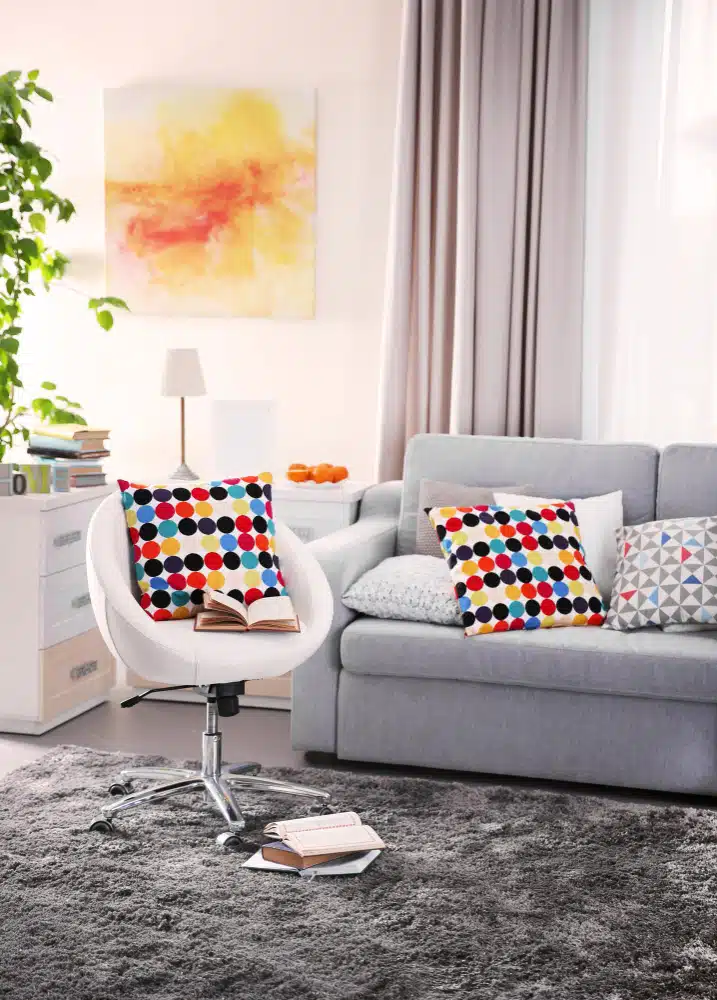 Las telas coloridas son en muchas ocasiones el contrapunto perfecto al color gris, permiten para agregar textura y suavidad a una habitación pintada en gris. El algodón, la lana y otros tipos de textiles se pueden utilizar para crear cojines, cortinas y tapicería que complementen el gris y permitan poner notas de color en las habitaciones sin necesidad de cambiar el mobiliario.